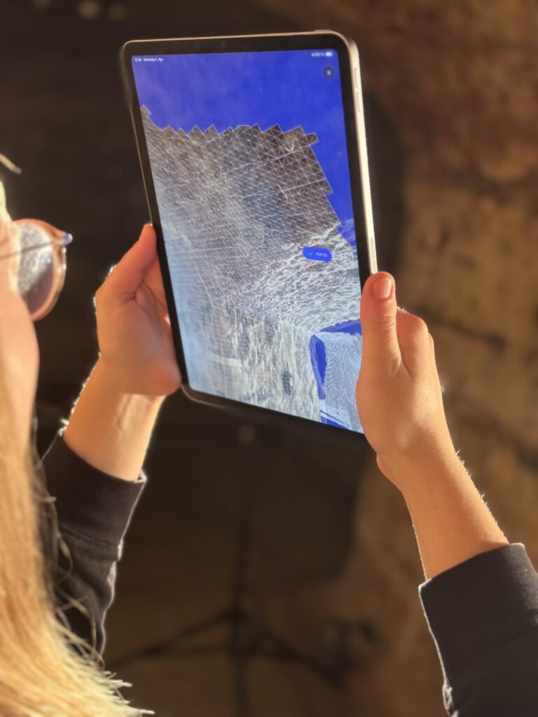 Bevor wir mit der Umsetzung begonnen haben, wurde die Location mithilfe des LiDAR-Sensors eines iPads und der Software Polycam gescannt. Das daraus erzeugte 3D-Modell diente als Ausgangspunkt für unsere virtuelle Szene – um dieses Modell herum entwickelten wir alle weiteren Elemente.