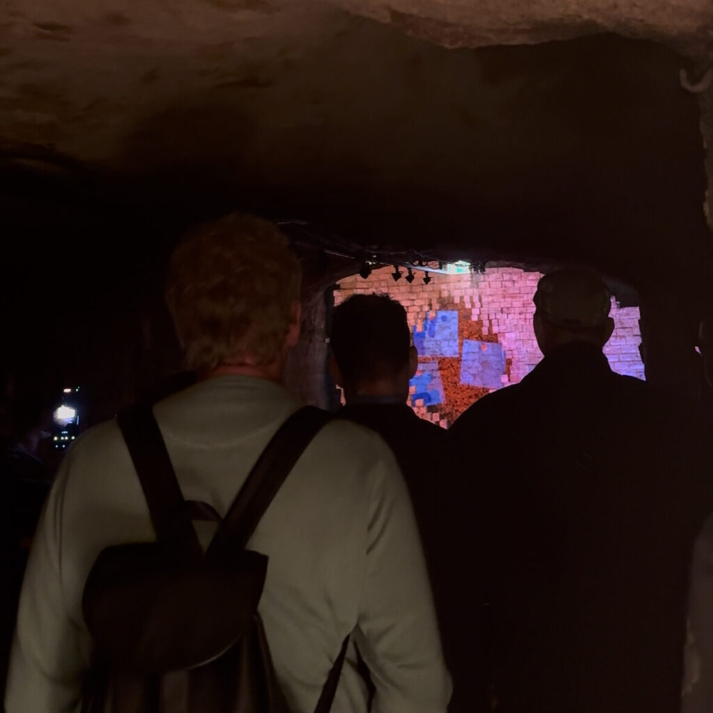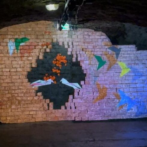 In den Nürnberger Felsengängen schwebten leuchtende Origami-Tauben durch die Dunkelheit und erfüllten die unterirdische Mauer mit Leben. Die Verbindung aus Licht, Klang und der historischen Atmosphäre der Felsengänge entführte die Besucher:innen auf eine eindrucksvolle Reise voller Symbolik und Emotion.